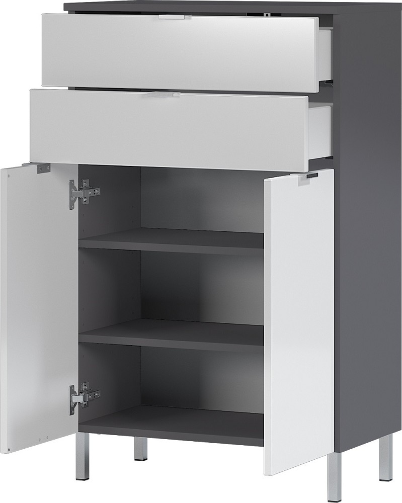 Die Badkommode der Badezimmerserie GW Mauresa von Germania glänzt mit einem reizvollen Dekormix. Durch den farblich voneinander abgesetzten Korpus und Frontbereich, hier in der Variante Graphit mit Hochglanzfronten in Weiß, erhalten Sie eine Kommode im gemütlichen und freundlichen Design. Ausreichend Stauraum finden Ihre Badutensilien in den zwei Schubladen und den zwei Türen, mit den dahinterliegenden Einlegeböden. Alle Scharniere des Möbels sind gedämpft und lassen sich dadurch sanft öffnen und schließen. Die melaminharzbeschichteten Oberflächen und hochwertigen ABS Kanten machen diese Kommode zusätzlich zu einem sehr robusten und pflegeleichten Begleiter. Aufgrund ihrer wertigen und stilvollen Optik lässt sich die Kommode sowohl bei bereits vorhandenen Badezimmermöbel integrieren oder die Germania Badezimmer Serie GW Mauresa entsprechend ergänzen. Top Qualität Made in Germany.