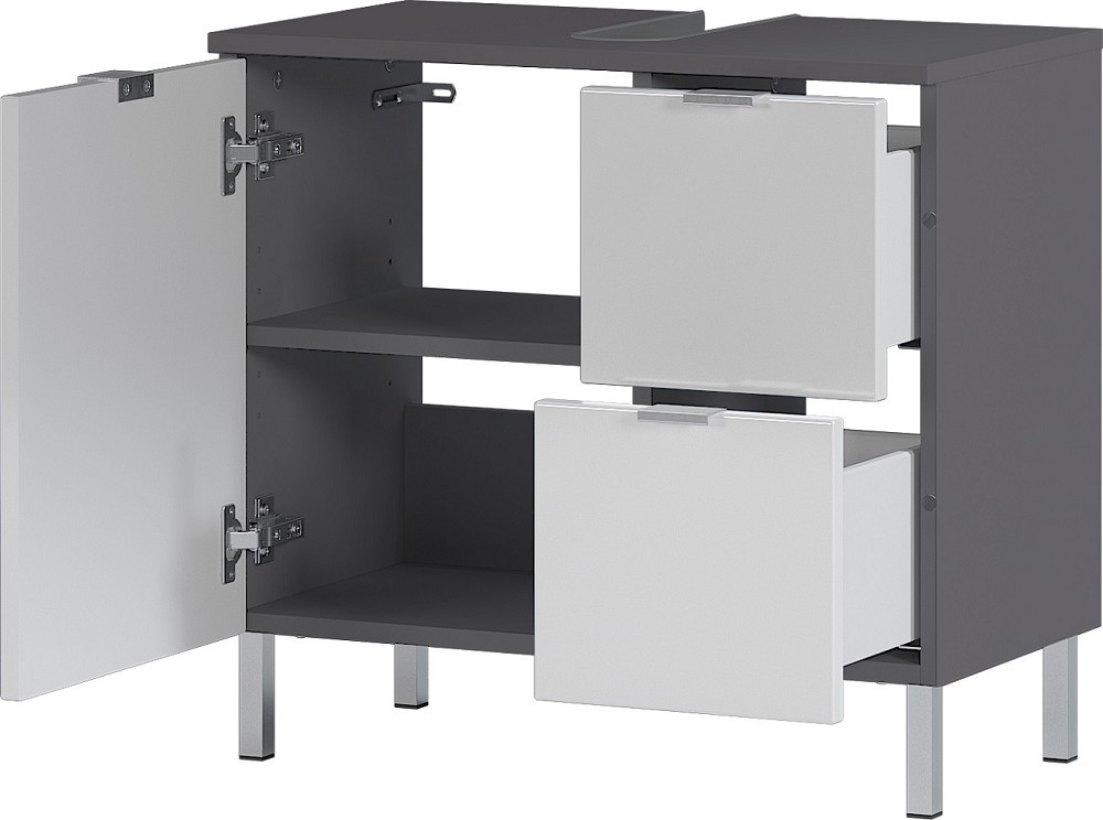 Der Waschbeckenunterschrank der Badezimmerserie GW Mauresa von Germania glänzt mit einem gemütlichen und freundlichen Design, in der Farbvariante Graphit mit Hochglanzfronten in Weiß. Ausgestattet mit zwei Schubladen und einer Tür, mit dahinterliegenden Einlegeboden, bietet er viel Platz für Ihre Badutensilien. Alle Scharniere des Möbels sind gedämpft und lassen sich dadurch sanft öffnen und schließen. Die drei Kantengriffe und die vier Füße sind aus Metall gefertigt und in der Farbe Chrom veredelt. Die Aussparung für den Siphon sorgt dafür, dass Sie diesen unterhalb des Waschbeckens platzieren und so im Inneren des Schranks verschwinden lassen können. Die melaminharzbeschichteten Oberflächen und hochwertigen ABS Kanten machen den Unterschrank zusätzlich zu einem sehr robusten und pflegeleichten Begleiter. Aufgrund seiner wertigen und stilvollen Optik lässt sich der Schrank sowohl bei bereits vorhandenen Badezimmermöbel integrieren oder die Germania Badezimmer Serie GW Mauresa entsprechend ergänzen. Top Qualität Made in Germany.