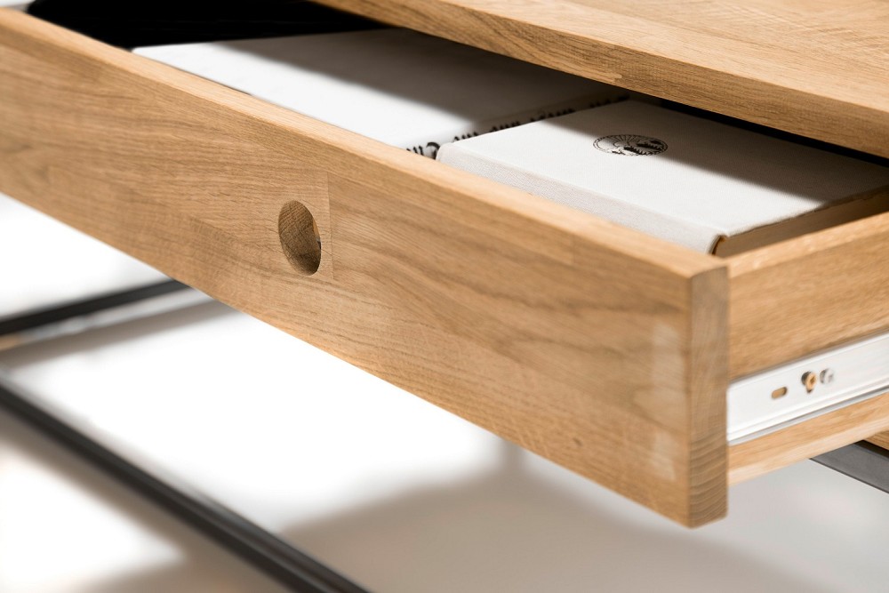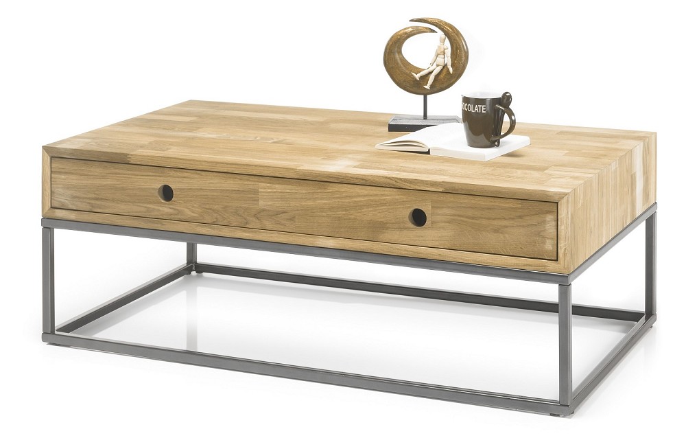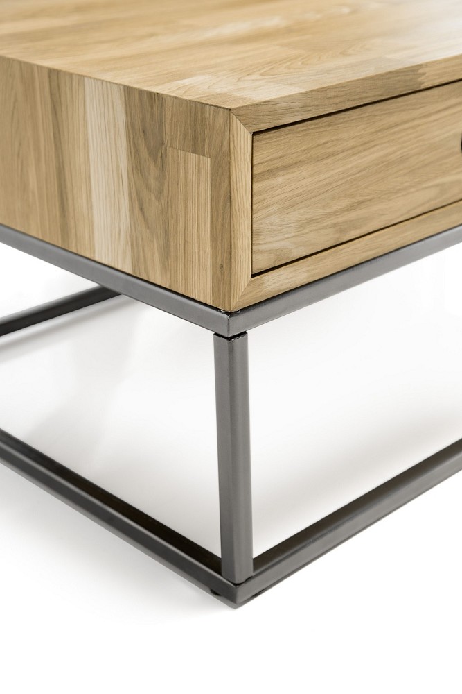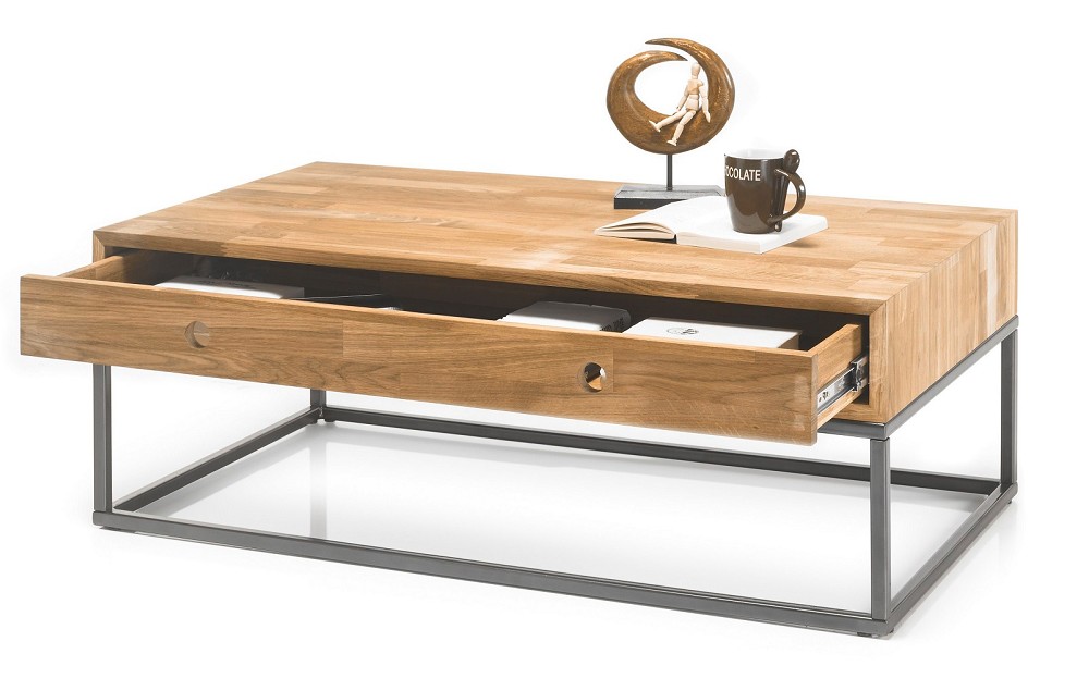 Aussergewöhnliches Design bietet der Couchtisch Quebec. Zugleich bietet er mit seinem Metallrahmen eine hohe Standsicherheit und Stabilität. Das Design wird durch den Holzrahmen in Eiche massiv optimal betont. Die geteilte Schublade ausgerüstet mit soft close Schließung bietet zusätzlichen Stauraum. Durch seine Natürlichkeit fügt sich der Couchtisch optimal in jedes Raumambiente ein.